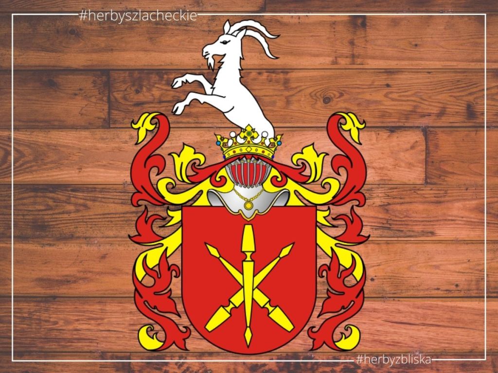 Blazon: W polu czerwonym trzy kopie złote w gwiazdę, środkowa na opak w słup. W klejnocie połukozioł srebrny wspięty.