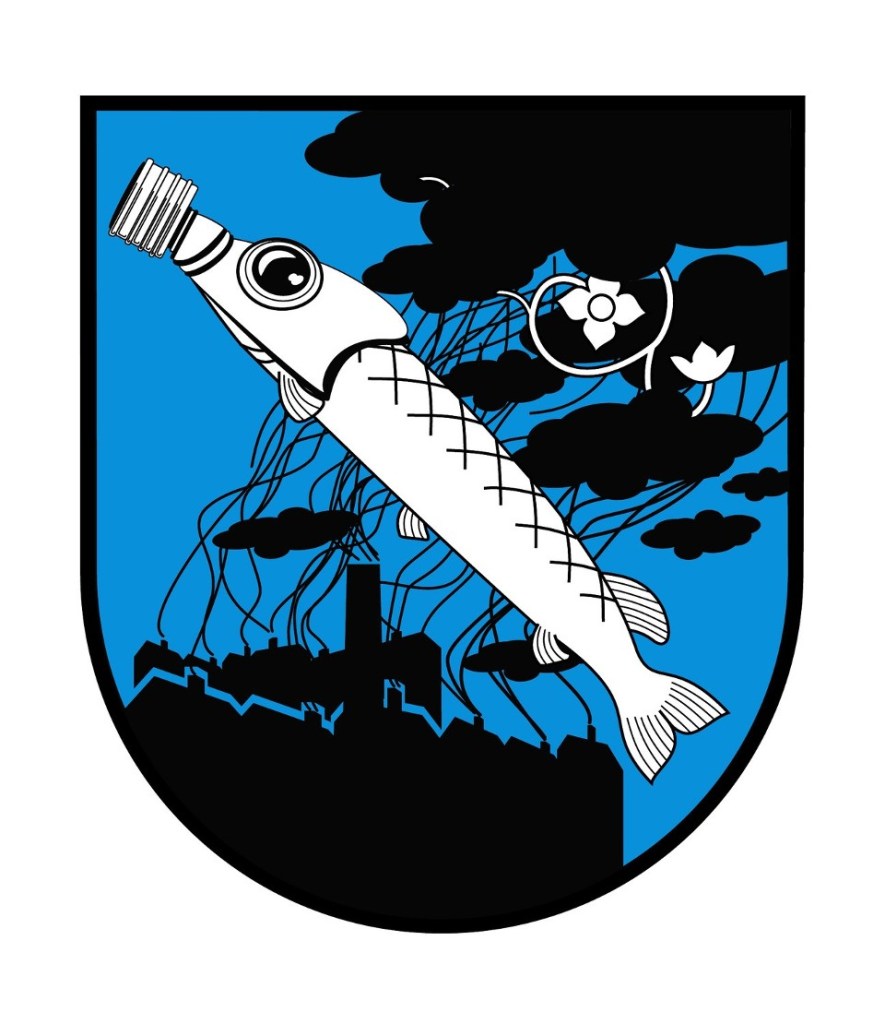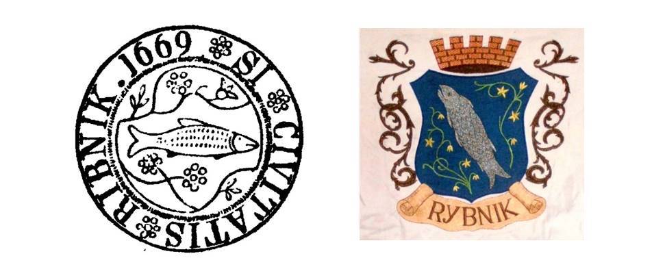 Herb przedstawia szczupaka w wodzie, pomiędzy dwoma kotewkami, czyli orzechami wodnymi, które rosną w zbiornikach o spokojnej wodzie, dosyć często spotykanych na tych terenach. Obecna wersja herbu przyjęta została w roku 2000, jednak samo godło wyobrażające rybę pochodzi już z najstarszych znanych pieczęci z XVI wieku i zasadniczo przez wieki pozostało ono niezmienione. Jedyne różnice dotyczą gatunku ryby (wcześniej wyobrażenia interpretowano również jako karpia oraz pstrąga), a także obecności bądź braku kotewek, które najprawdopodobniej są rodzajem damaskinażu, czyli ornamentu wypełniającego pole tarczy, który z czasem przybrał konkretną formę rośliny wodnej.