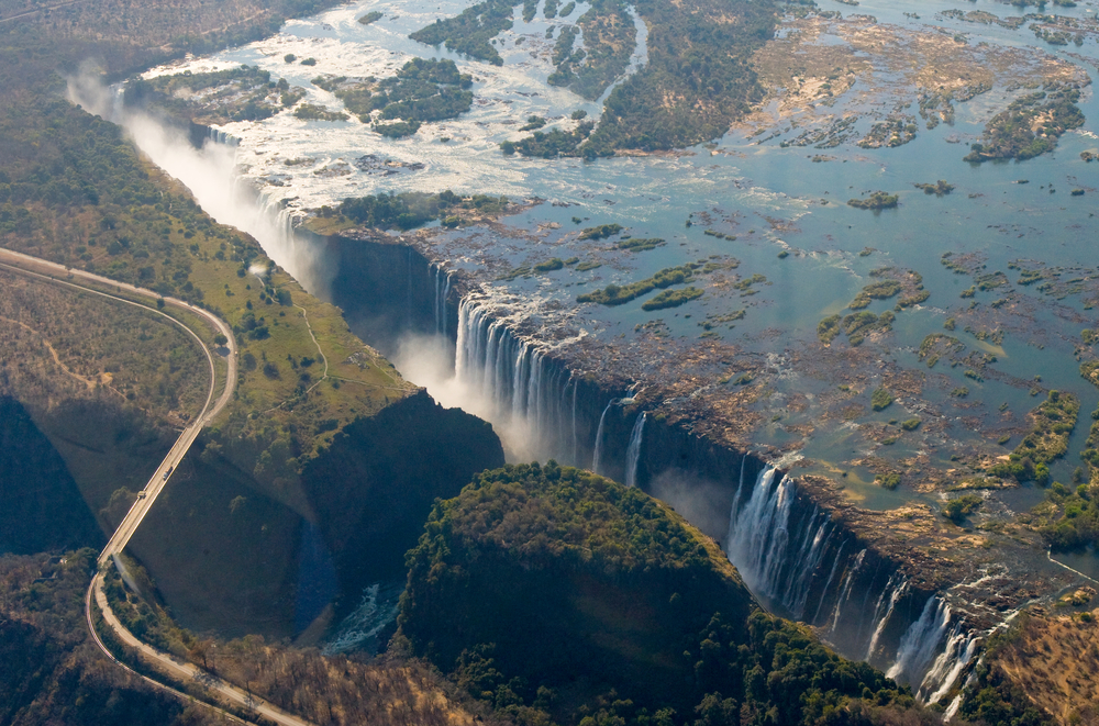 - tarcza przedstawia białe kaskady wody spływające po czarnych skałach, co symbolizuje Wodospady Wiktorii, jedną z najbardziej znanych atrakcji turystycznych kraju, a jednocześnie rzekę Zambezię, od której pochodzi nazwa kraju i która w swym środkowym biegu tworzy Wodospady Wiktorii