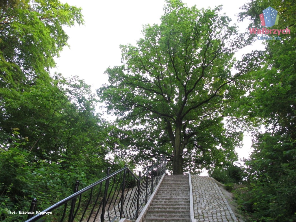 Przez długi czas sądzono, że dąb z herbu miał swój pierwowzór w prawdziwym drzewie, które rosło na dawnym zboczu kamieniołomu. Przed kilku laty jednak dokonano odkrycia, które kazało zrewidować ten pogląd. Otóż podczas prac rewitalizacyjnych w Parku Sobieskiego natrafiono na kamień niemal w całości ukryty pod warstwą ziemi, na którym wyryty był napis w języku niemieckim: „Stadteiche gapflanzt 1933 antstelle der Wappeneiche”, co znaczy: „Miejski dąb posadzony w 1933 r. na pamiątkę dębu herbowego”. Okazało się, że właśnie w tym miejscu rósł dąb, który był pierwowzorem godła z herbu miejskiego z 1764. r. Niestety w 1932 r. drzewo uschło i zostało usunięte, a na to miejsce w kolejnym roku posadzono nowy dąb, który rośnie do dziś. Przy nim właśnie umieszczono kamień z inskrypcją.