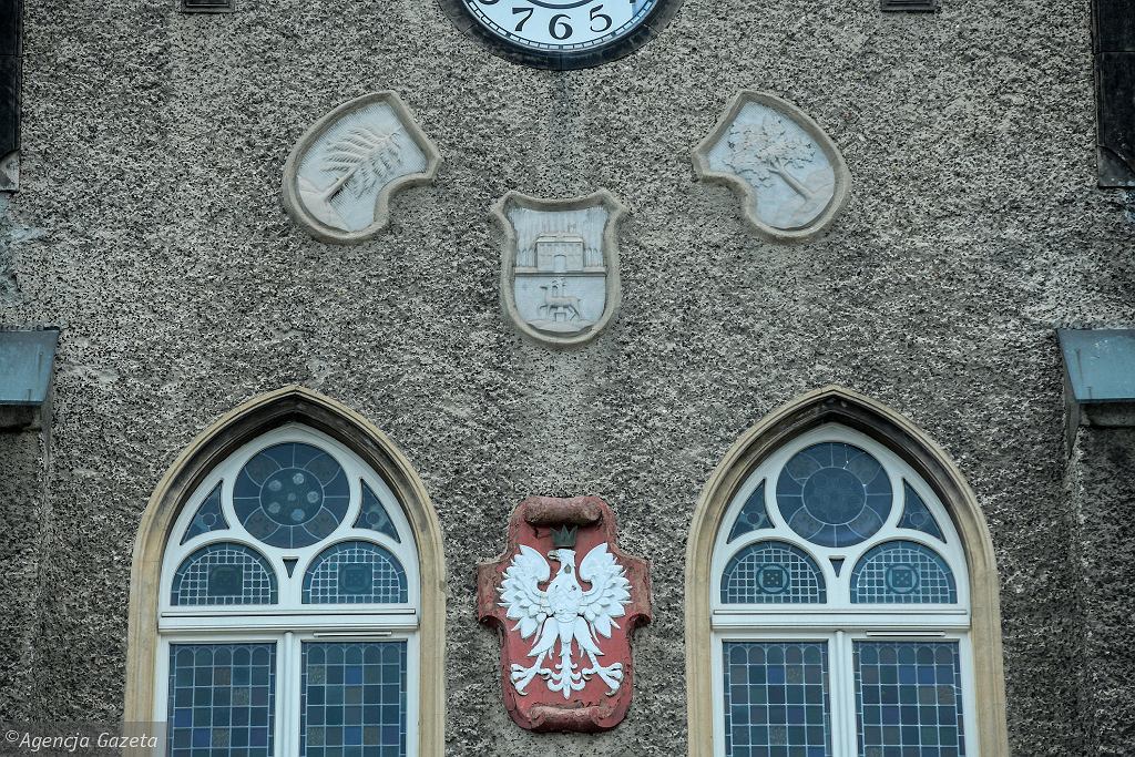 Fasadę wałbrzyskiego ratusza zdobią trzy dawne herby miasta, choć w rzeczywistości było ich więcej. Pierwszy herb przedstawiał w polu błękitnym zieloną jodłę z czarnymi szyszkami na pagórku i funkcjonował od 1675 r. Od 1720 r. używano herbu dwudzielnego w pas, na którym w polu górnym widniał pałac w otoczeniu topoli, zaś w polu dolnym był jeleń stojący przed kolumną. Od 1764 r. zaczęto używać herbu z dębem na tle gór. To właśnie te trzy miejskie symbole znajdują się na wspomnianej fasadzie. Kolejny herb powstał w 1809 roku i przedstawiał dąb, ale bez gór w tle. Te ostatnie wróciły do miejskiego herbu w 1939 r., jednak nie na długo. W 1976 r. powstał herb, w którym pole tarczy jest dzielone w słup. Po prawej stronie w polu czerwonym umieszczono połuorła białego, w lewym polu, złotym, widniała połowa zielonego dębu, zaś całość umieszczono na zielonej murawie, przeciętej czarnymi pasami, symbolizującymi złoża węgla. W 1991 roku powstał obecnie obowiązujący wzór herbu.