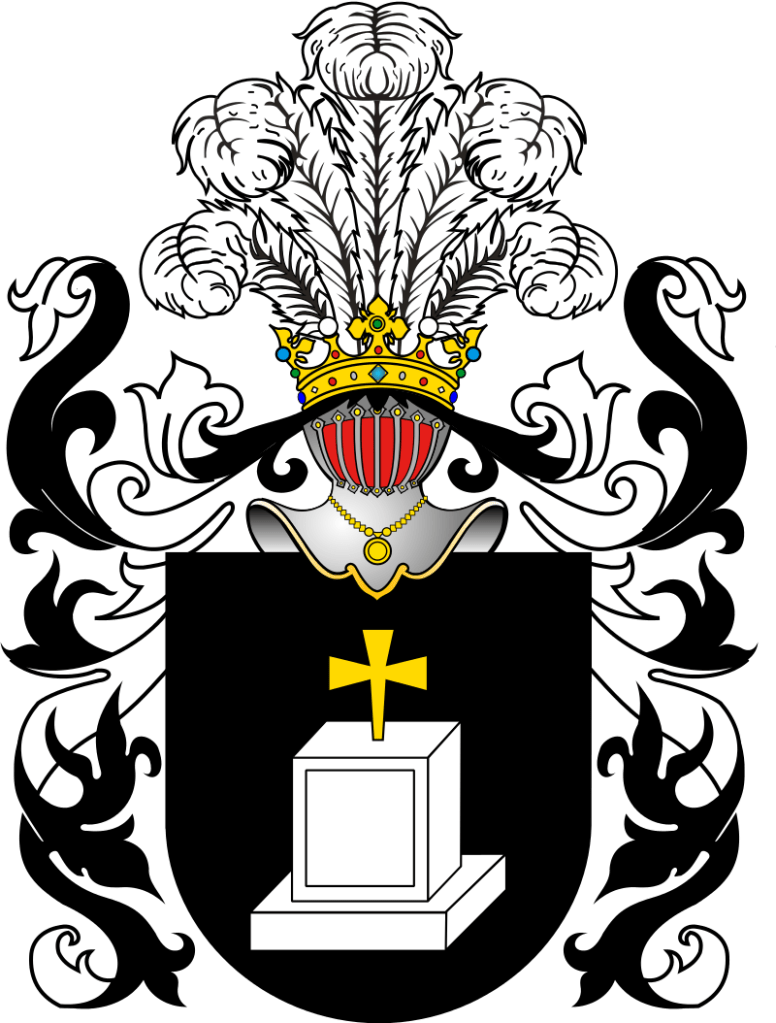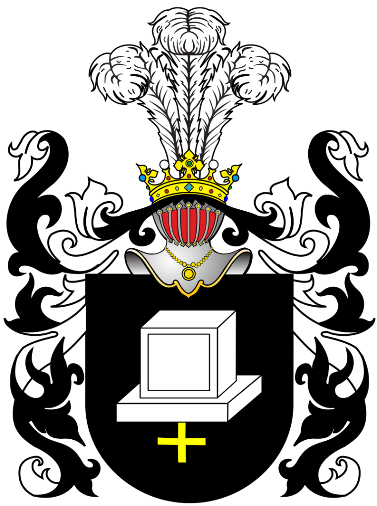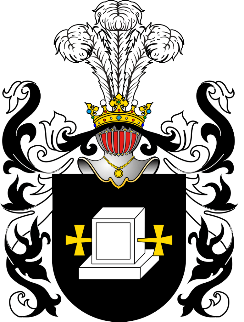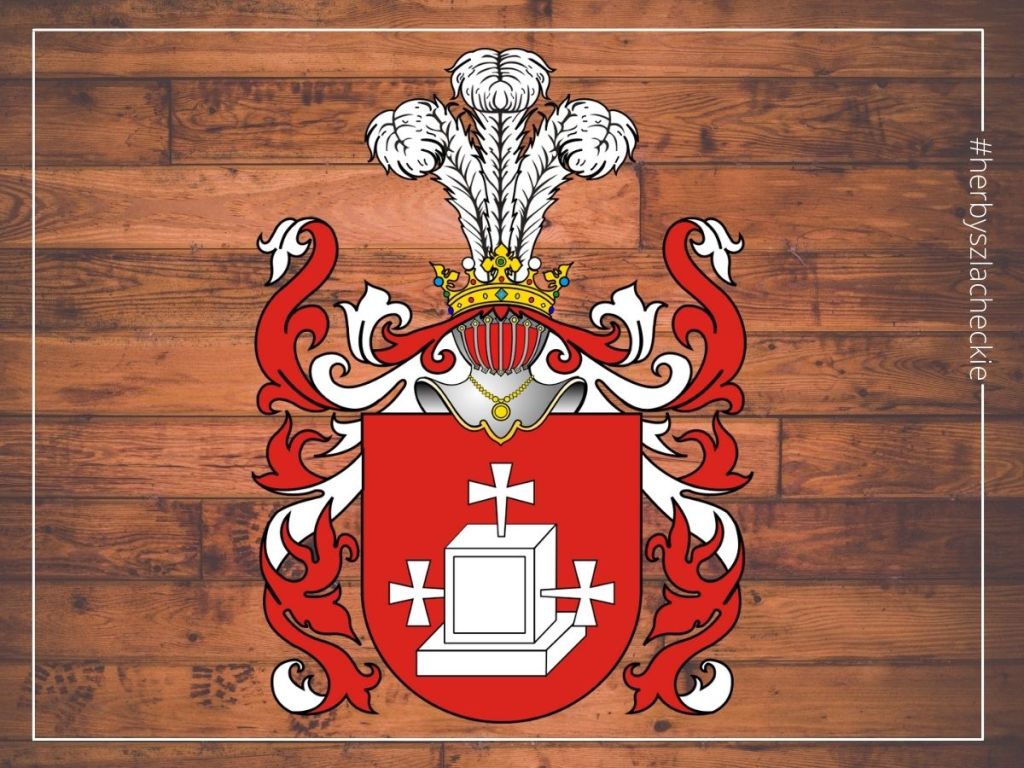 Blazon: w polu czerwonym kamienny grób srebrny z takimiż trzema krzyżami zaćwieczonymi, jeden u szczytu i dwa po bokach w pas. W klejnocie trzy strusie pióra.