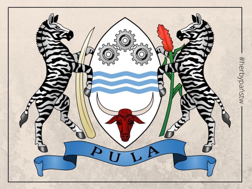 Republika Botswany to kraj w południowej Afryce, bez dostępu do morza. Od XVI wieku zamieszkiwana przez ludy Tswana z rodziny Bantu, od 1885 r. pod brytyjskim protektoratem (nazywana w tym czasie Beczuana). W 1966 r. kraj ogłosił niepodległość. W tym samym roku przyjęto herb państwa, zawierający w sobie symbole opisujące bogactwa kraju.